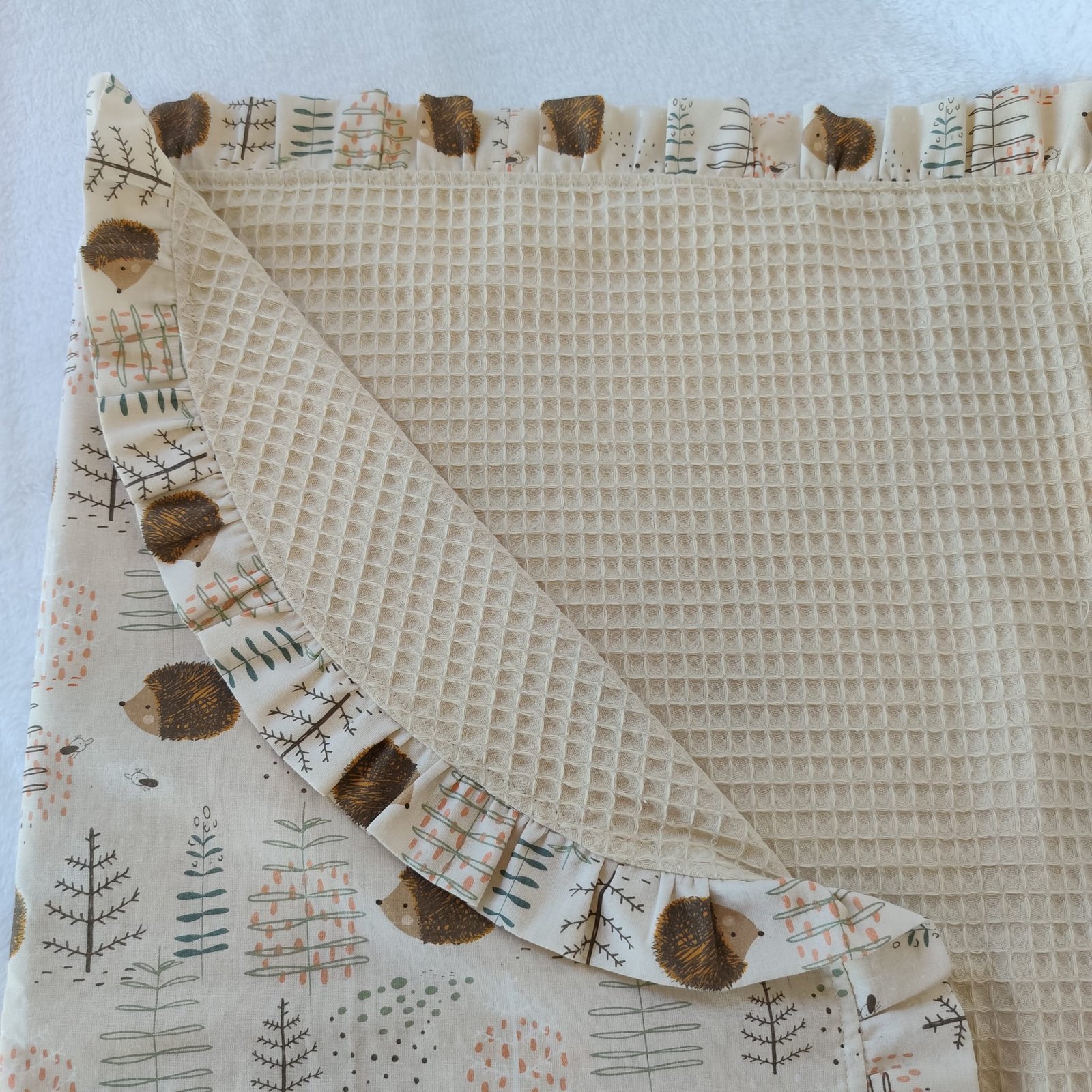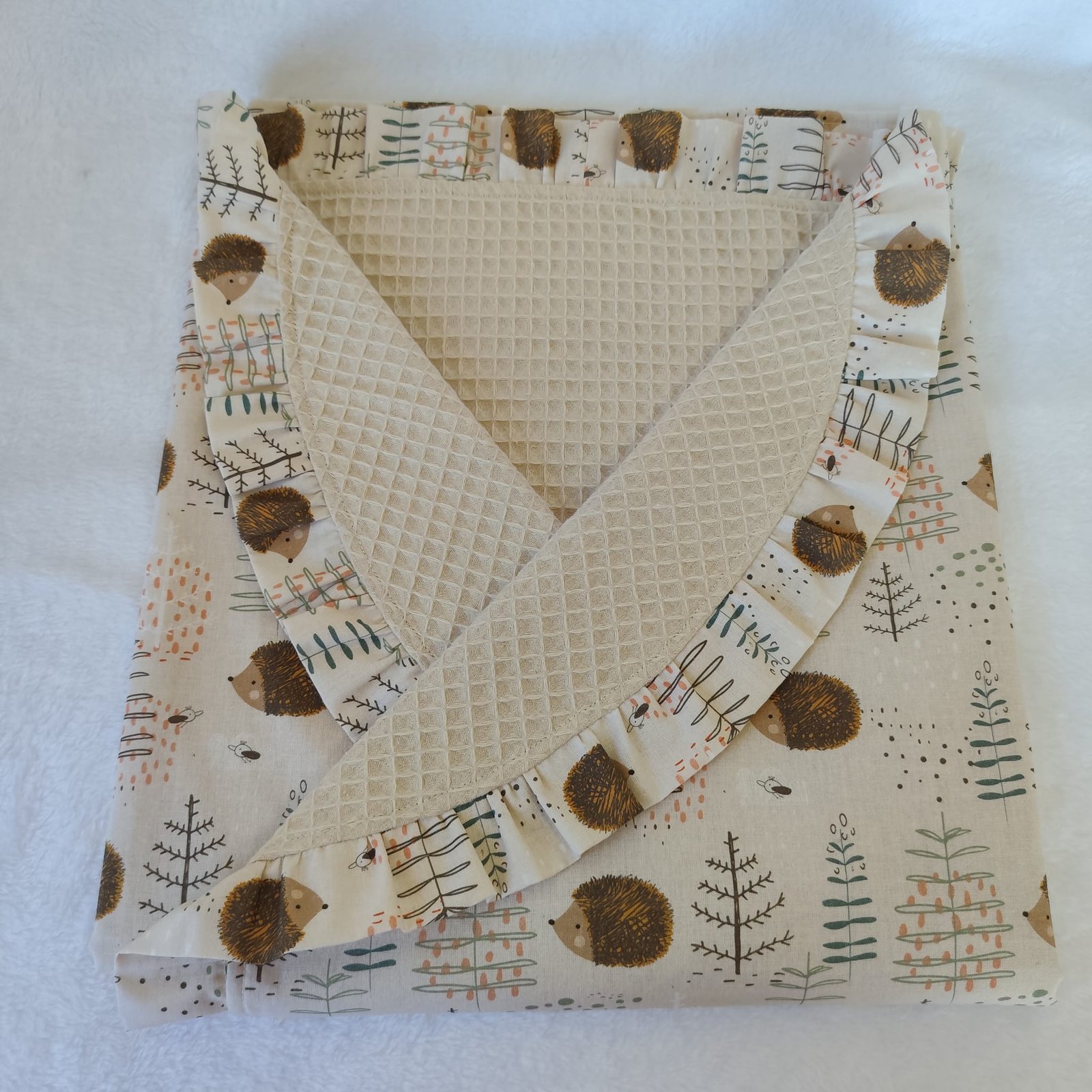 Parte interior: Acabado en tejido de waffle 100% algodón en un sofisticado tono champagne. Su textura esponjosa y transpirable ayuda a mantener una temperatura ideal, siendo perfecto para primavera y verano.