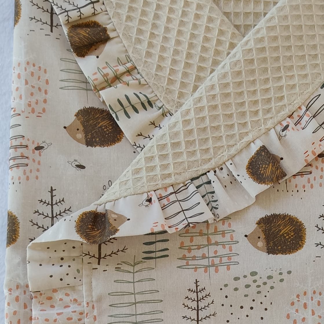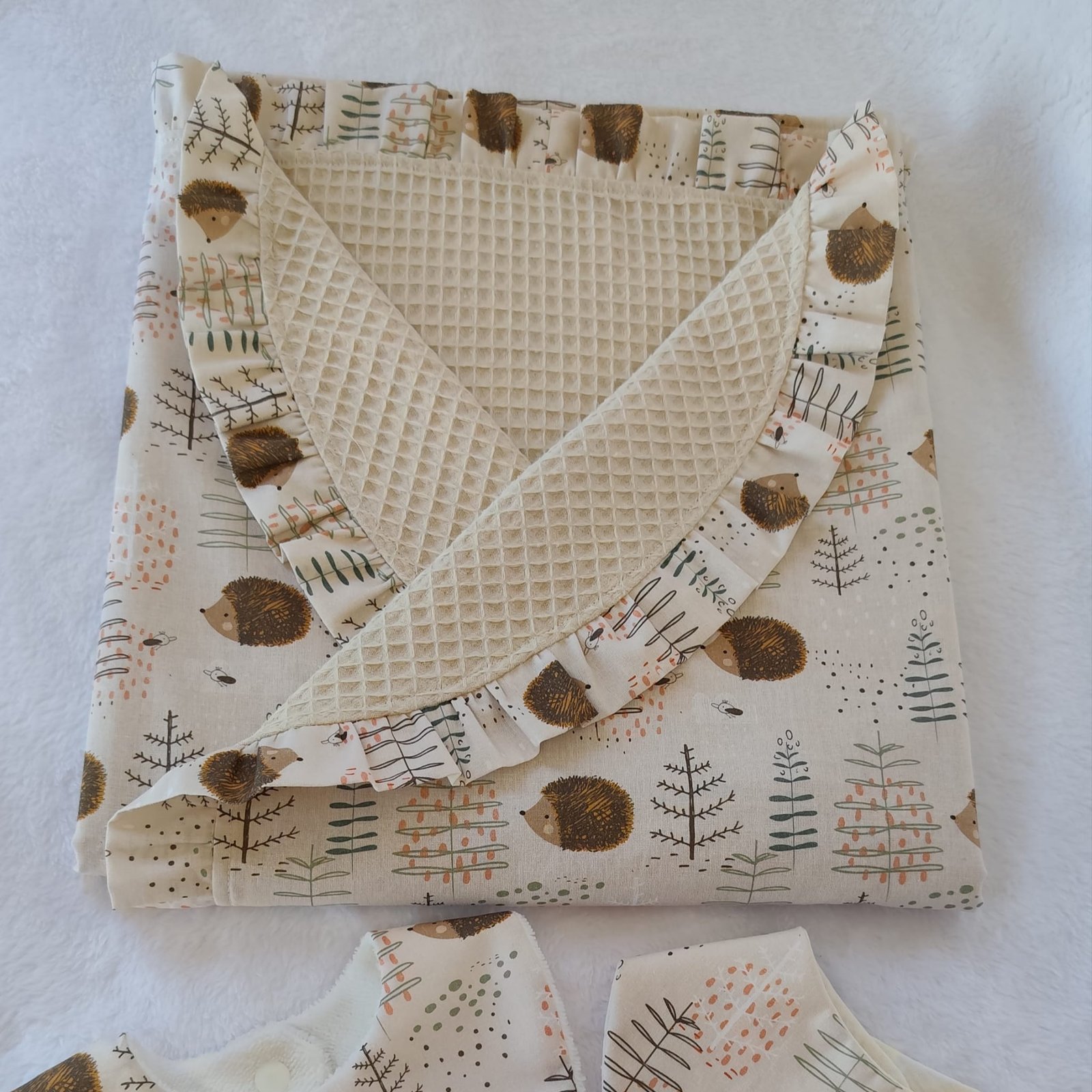 Parte superior: Confeccionado en tejido de popelín 100% algodón con un delicado y dulce estampado de erizos. Un material ligero y muy respetuoso con la piel sensible del recién nacido.