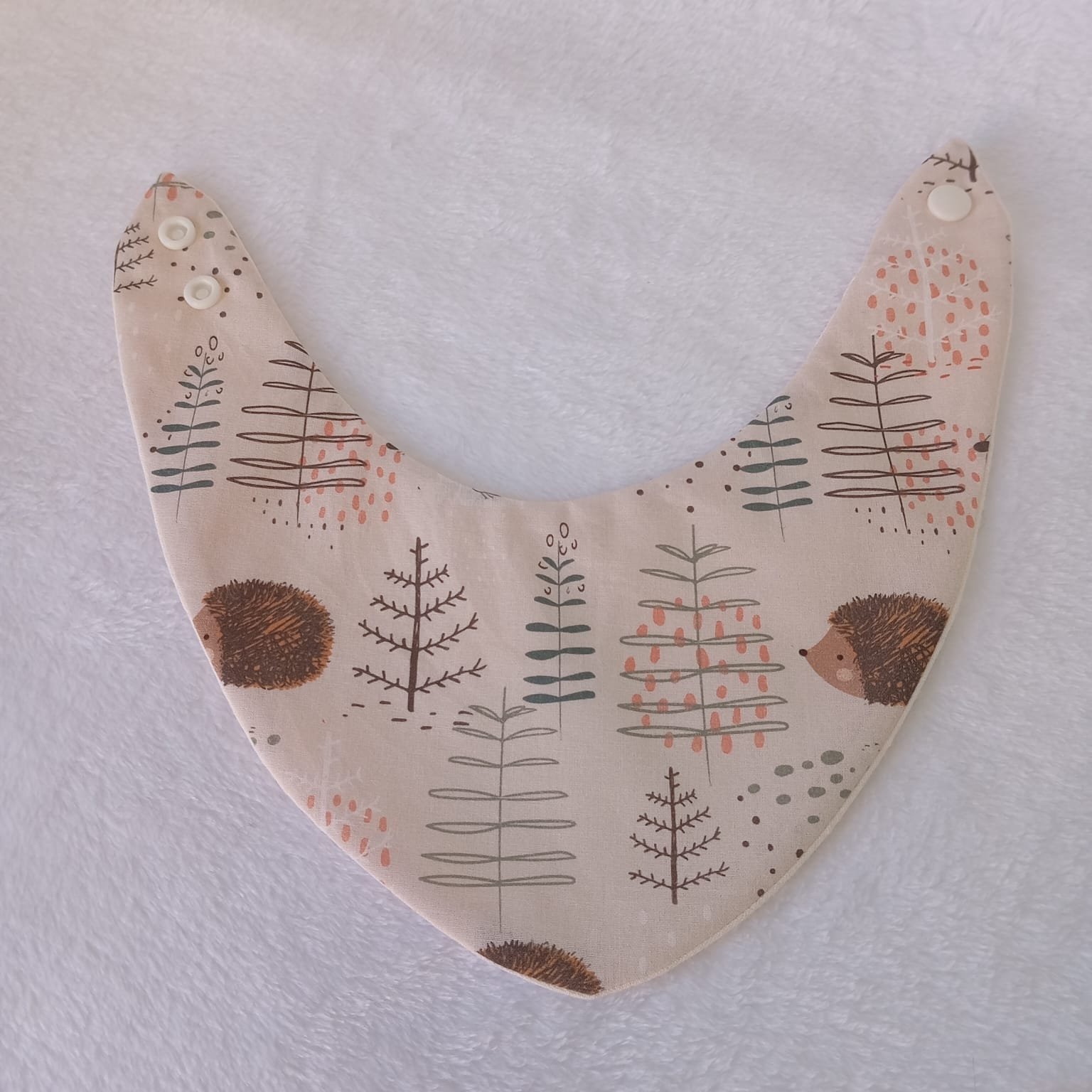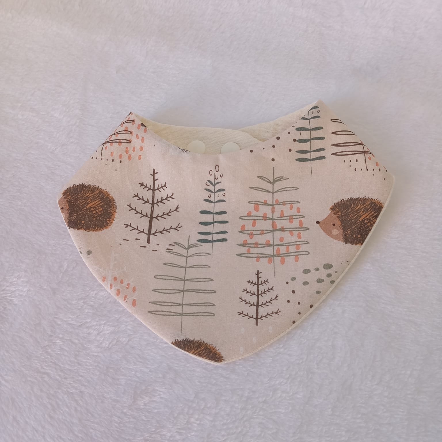 Una bandana práctica y encantadora para absorber babitas con estilo. Su estampado Erizos del Bosque en tonos tierra es ideal para acompañar cualquier look con un toque natural.