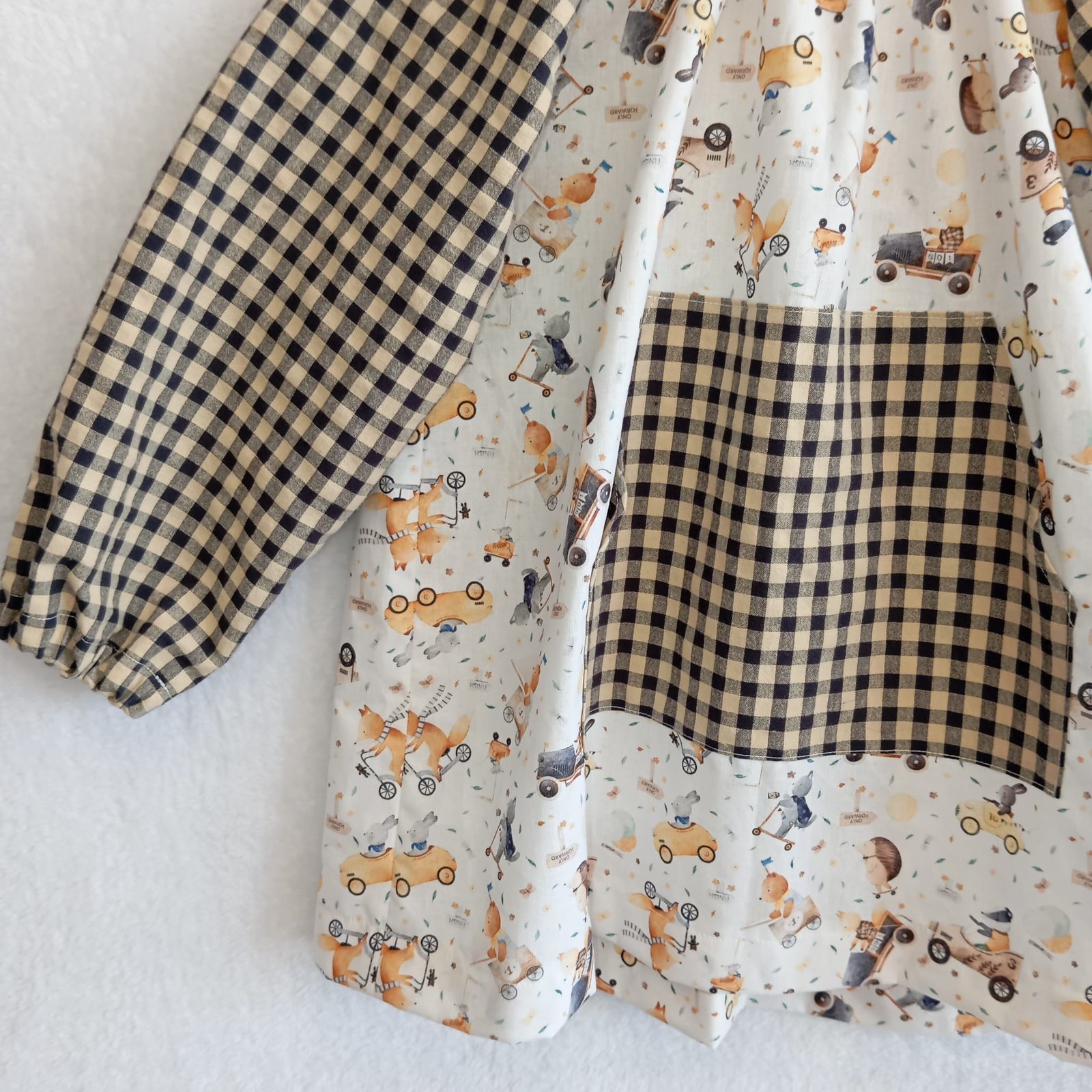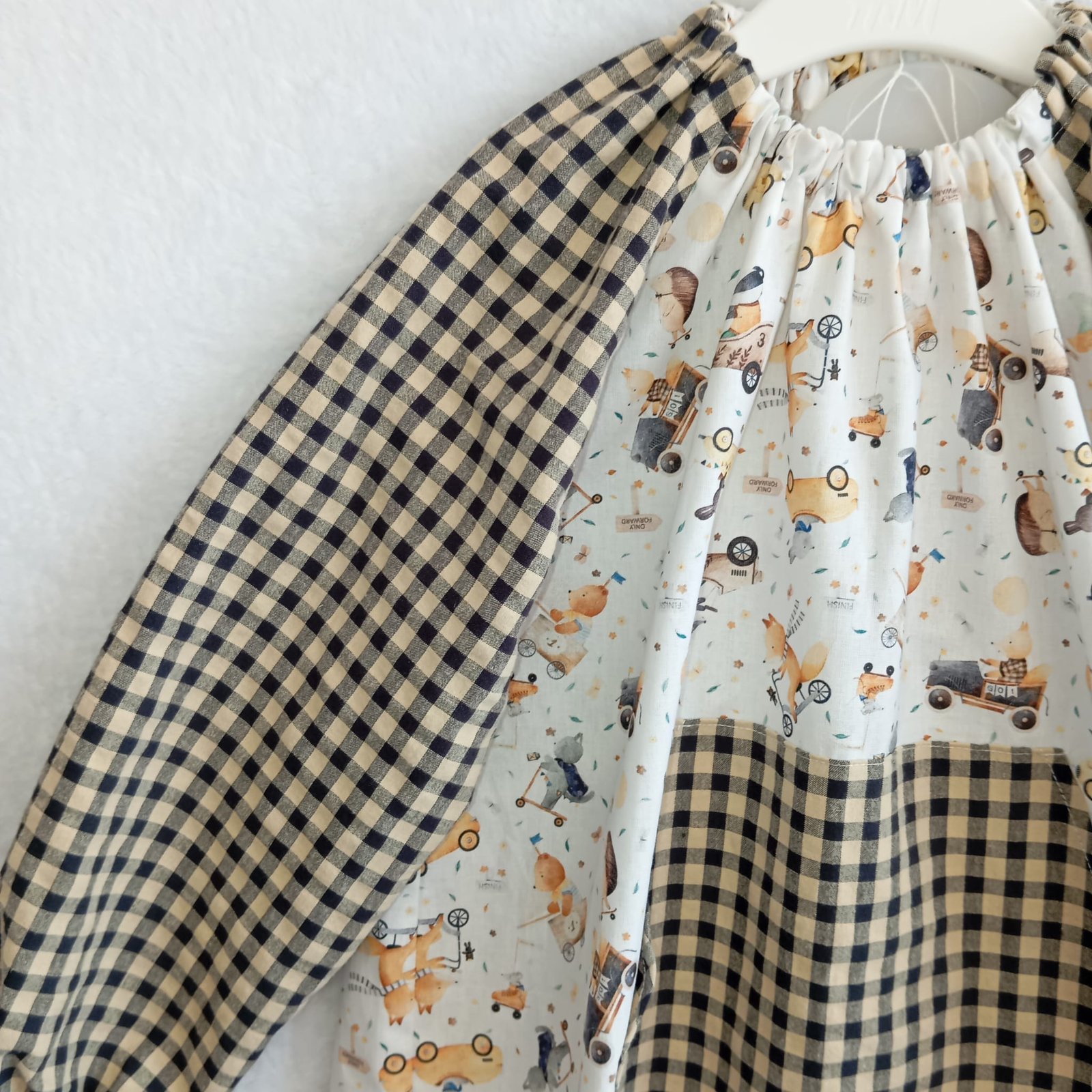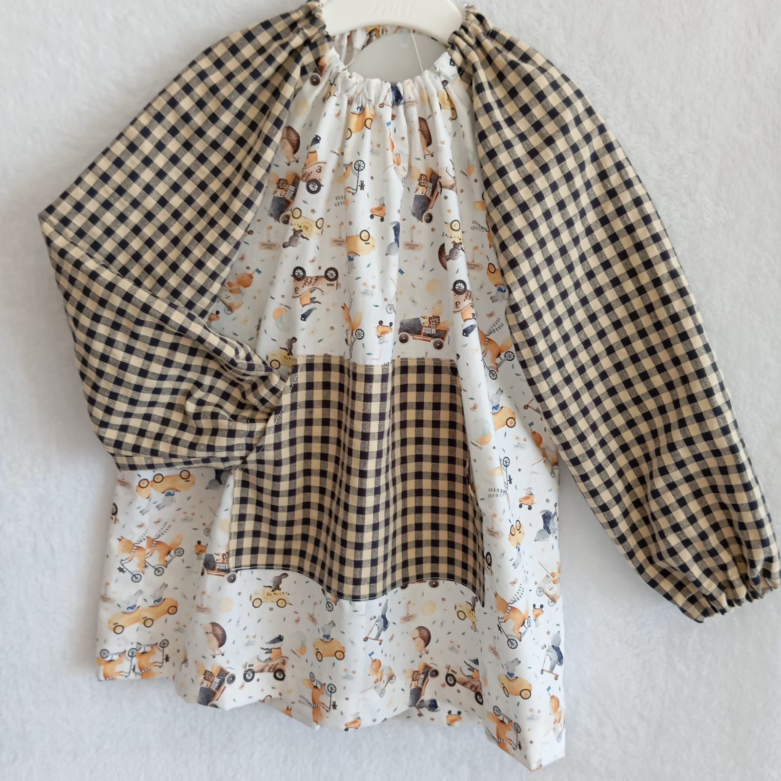 Bata escolar perfecta para la guardería, cómoda y práctica. Con cuello elástico y mangas raglán que facilitan que los peques se la pongan solos. Hecha a mano en algodón suave y seguro para la piel.