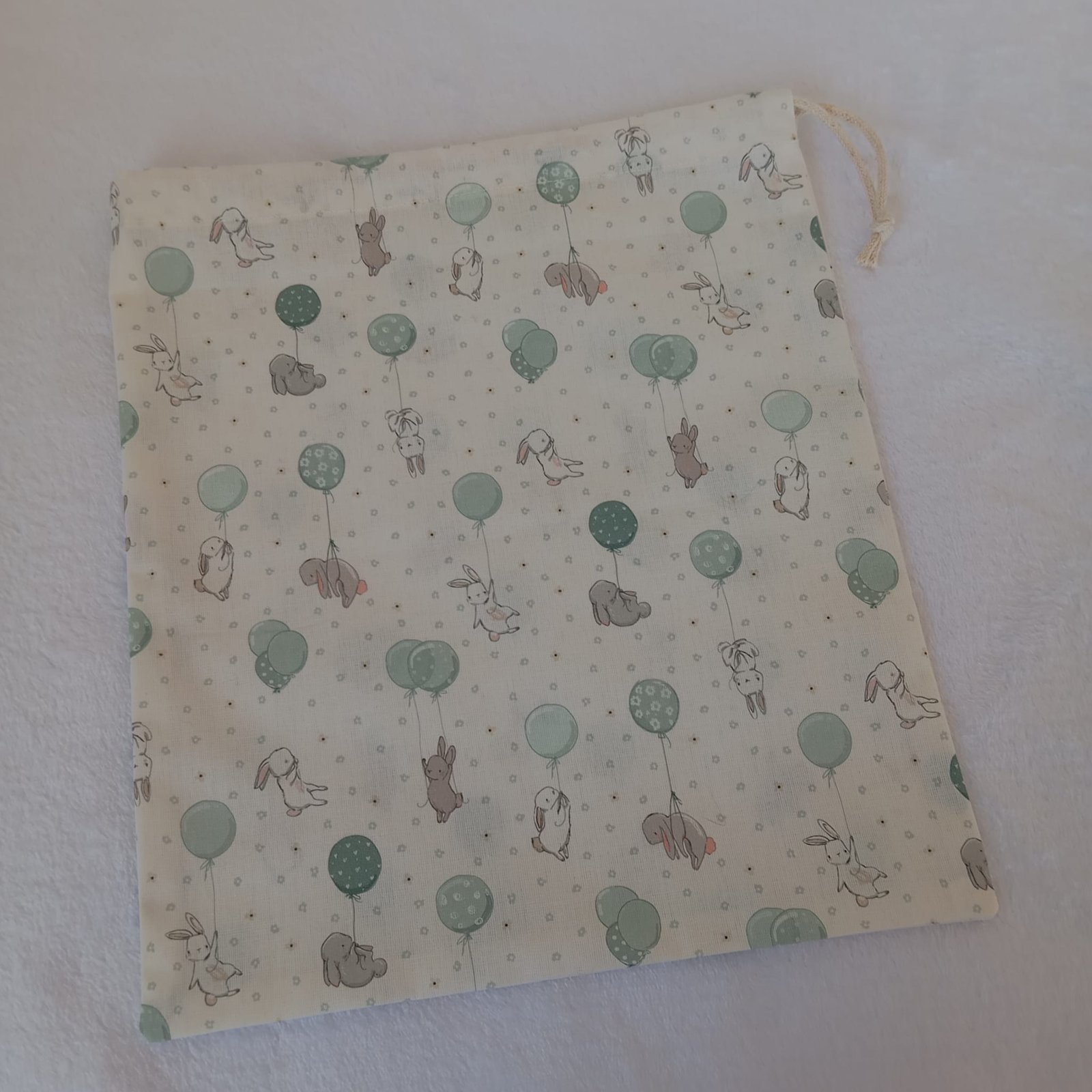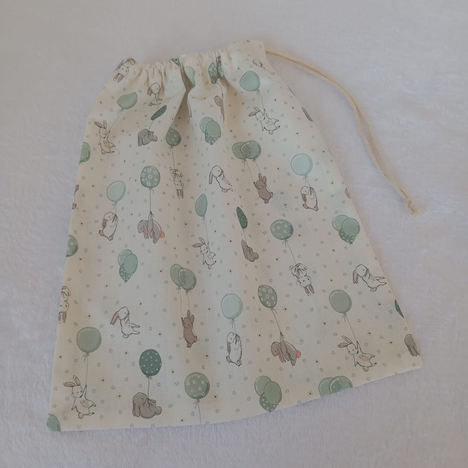 Tejido exterior: Popelín 100% algodón, estampado con tiernos conejitos con globos. Un tejido suave, transpirable y resistente, perfecto para el uso diario.