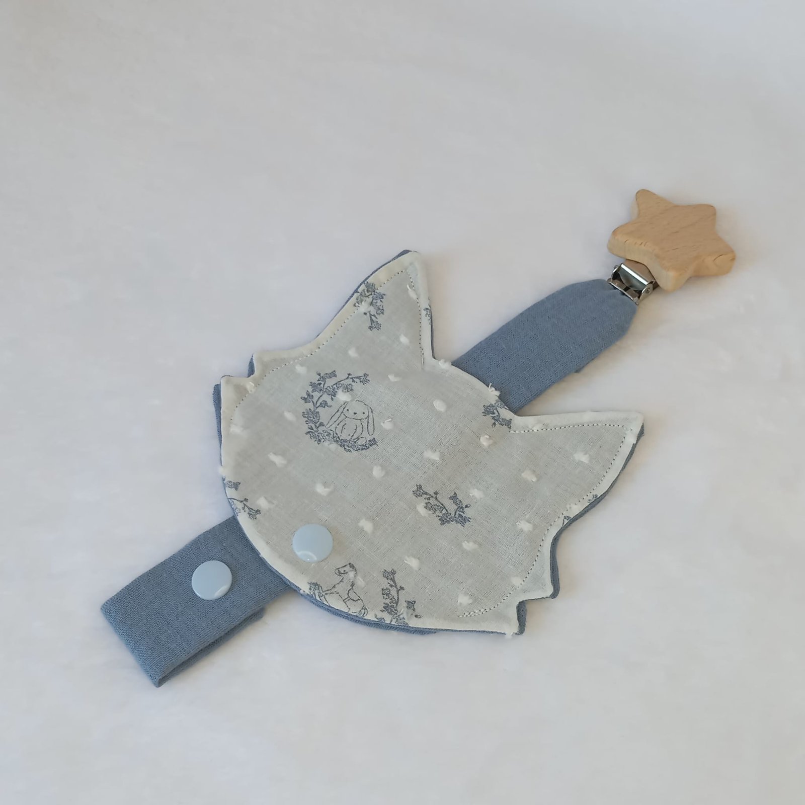 Chupetero con cinta (22 cm) + pinza: cinta de popelín azul clásico unida a una pinza de madera natural en forma de estrella; el clip metálico no contiene níquel y sujeta con firmeza sin dañar la ropa del bebé.