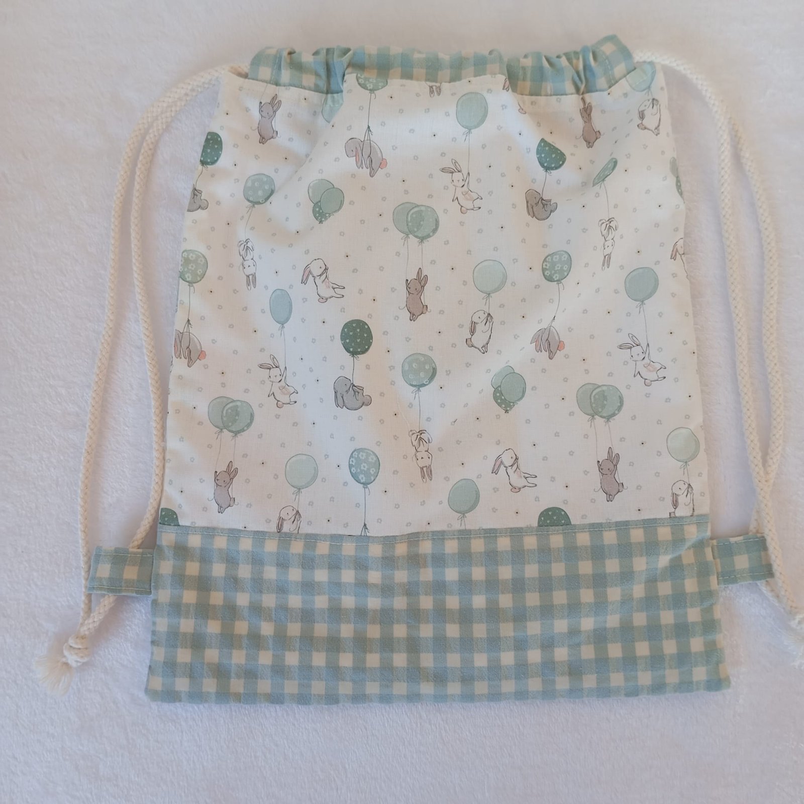 Parte exterior: Combinación de popelín y vichy 100% algodón en tonos verdes mint, con un dulce estampado de conejitos con globos. Su textura es suave, ligera y muy agradable al tacto.