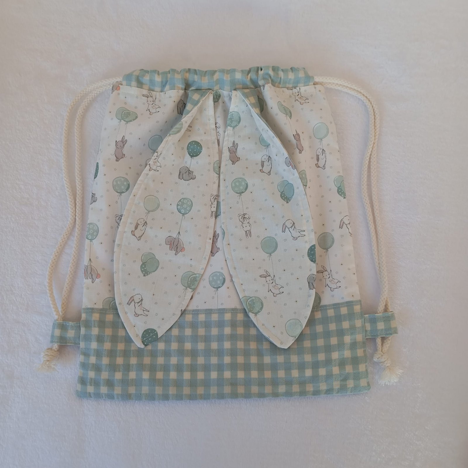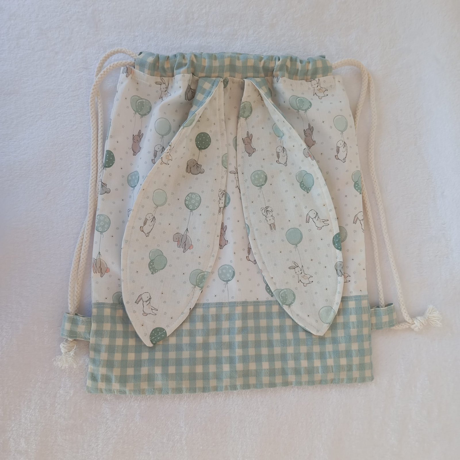 Orejas decorativas: Una pareja de grandes orejas de conejo con doble cara: una en el mismo tejido estampado de conejitos y la otra en vichy a juego. Un detalle encantador que aporta coherencia, ternura y originalidad.