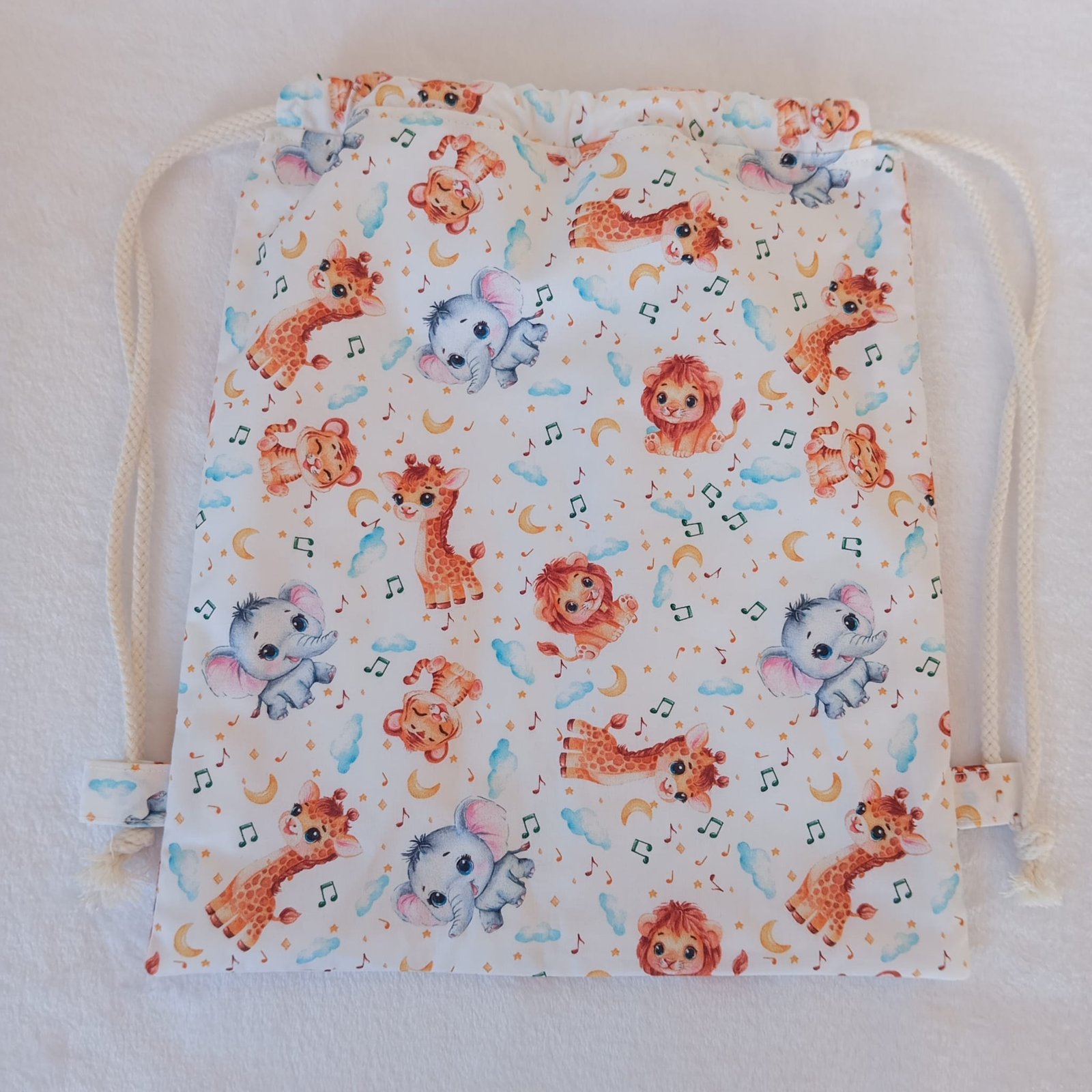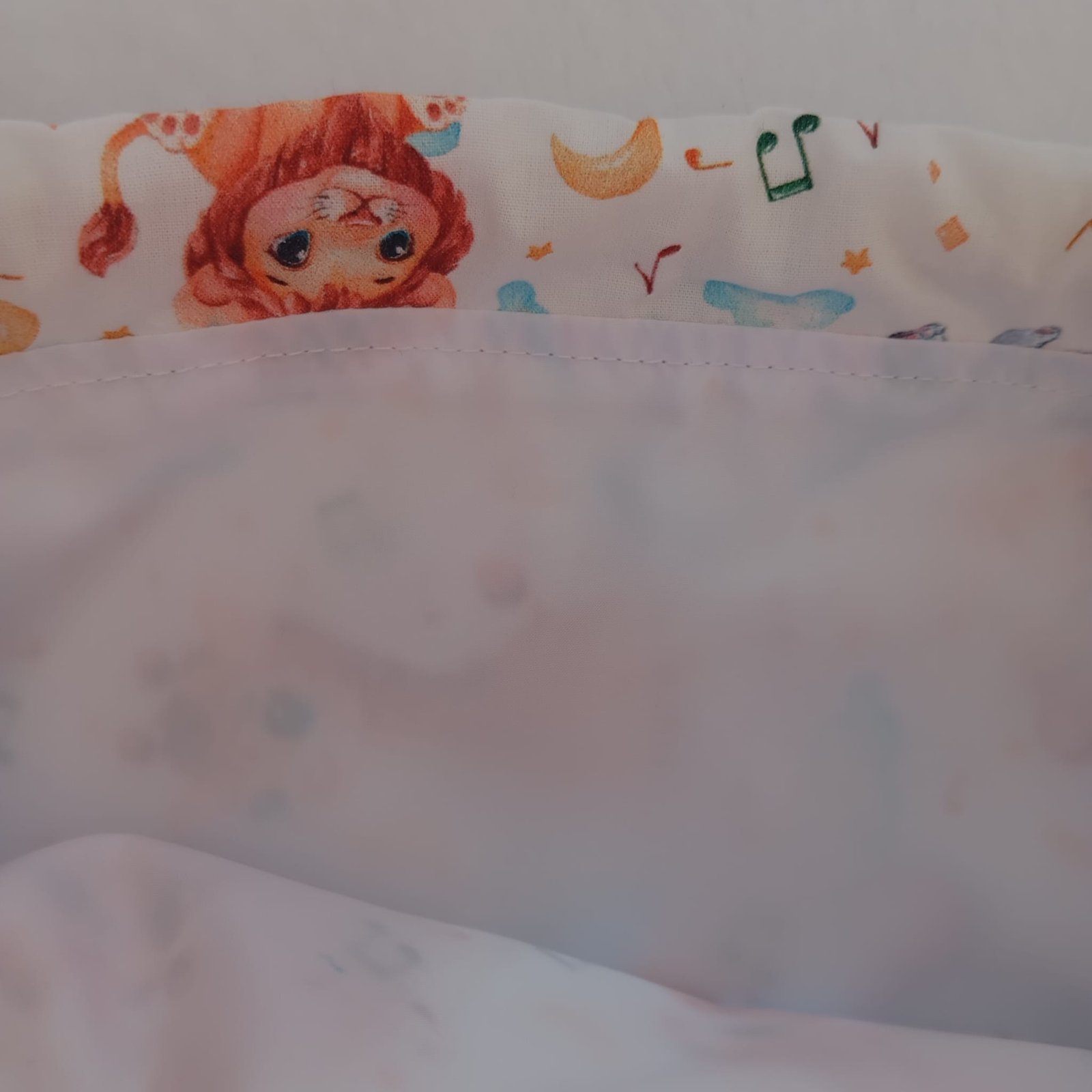 Parte exterior: Popelín 100% algodón en color crudo, con un delicado y divertido estampado de animales de safari en estilo infantil. Su textura es suave, ligera y agradable al tacto.