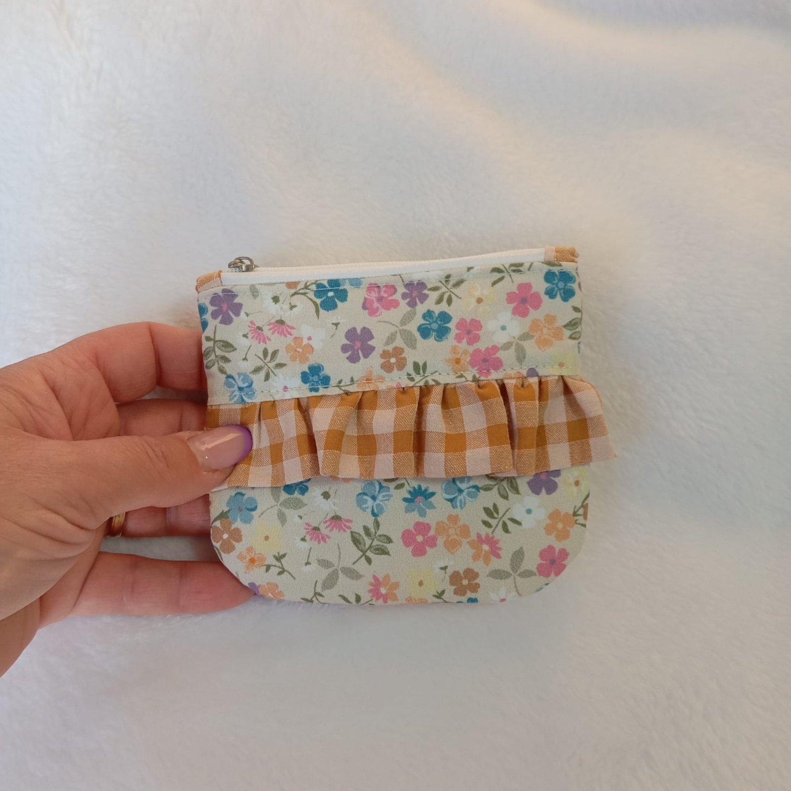 Fresco, dulce y con un marcado aire artesanal, el monedero Flores Primavera & Vichy Caramelo combina un delicado estampado floral en tonos suaves con un volante decorativo en vichy color caramelo. La unión de ambos tejidos crea una pieza luminosa y acogedora, perfecta para llevar pequeños esenciales con un estilo romántico y primaveral.