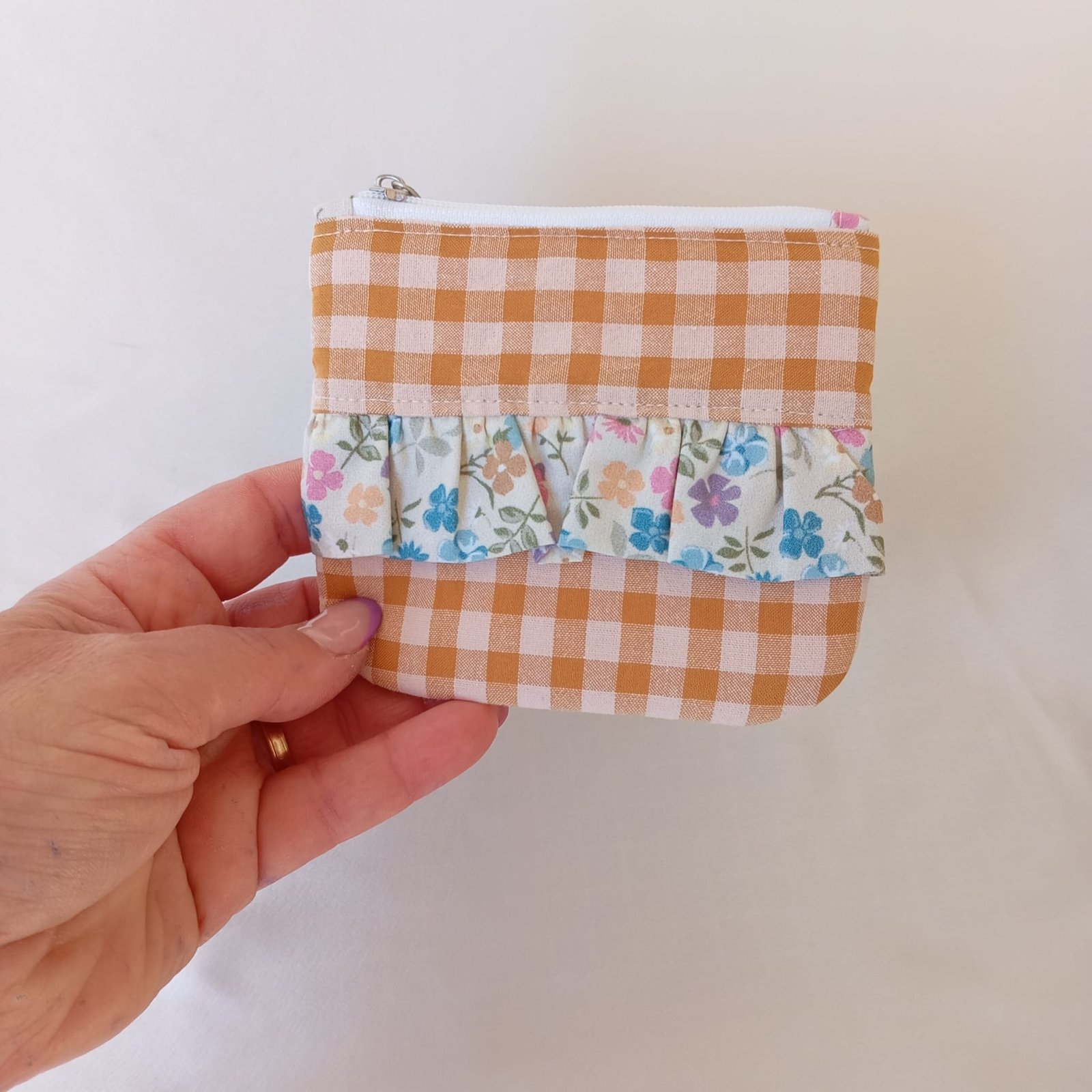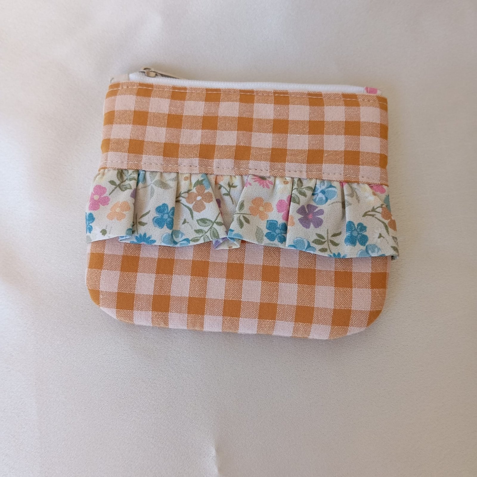Dulce, cálido y con un encanto muy artesanal, el monedero Vichy Primavera Volante combina una base en tejido vichy caramelo con un delicado volante en estampado Primavera, lleno de flores en tonos pastel. La mezcla de ambos tejidos crea una pieza suave y alegre, perfecta para llevar pequeños esenciales con un estilo romántico y acogedor.
