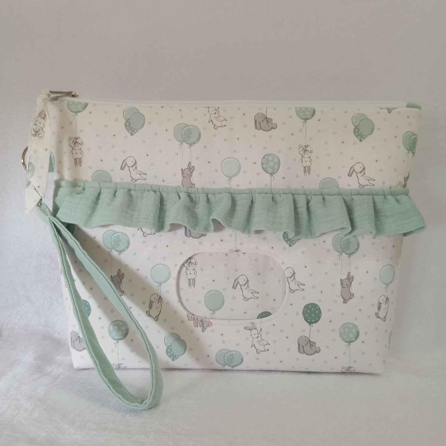 Una pañalera amplia, ligera y muy funcional, perfecta para llevar pañales, toallitas y pequeños imprescindibles del bebé dentro del bolso o carrito. El volante decorativo y el estampado personalizable aportan un toque delicado y especial, ideal tanto para el día a día como para regalo.