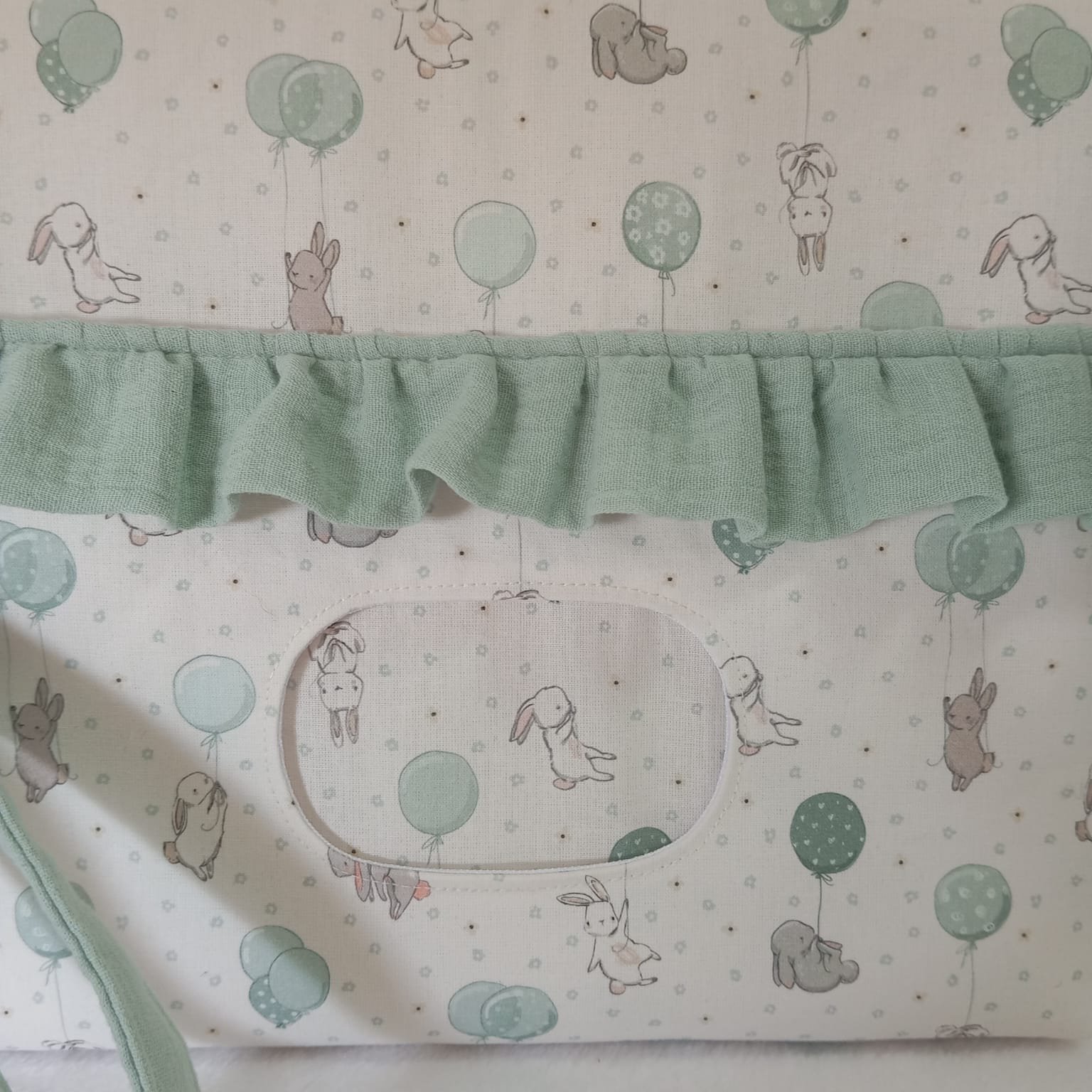 Parte exterior: Confeccionada en popelín 100 % algodón con estampado personalizable, combinado con muselina en tono suave y volante decorativo que aporta un acabado dulce y elegante.