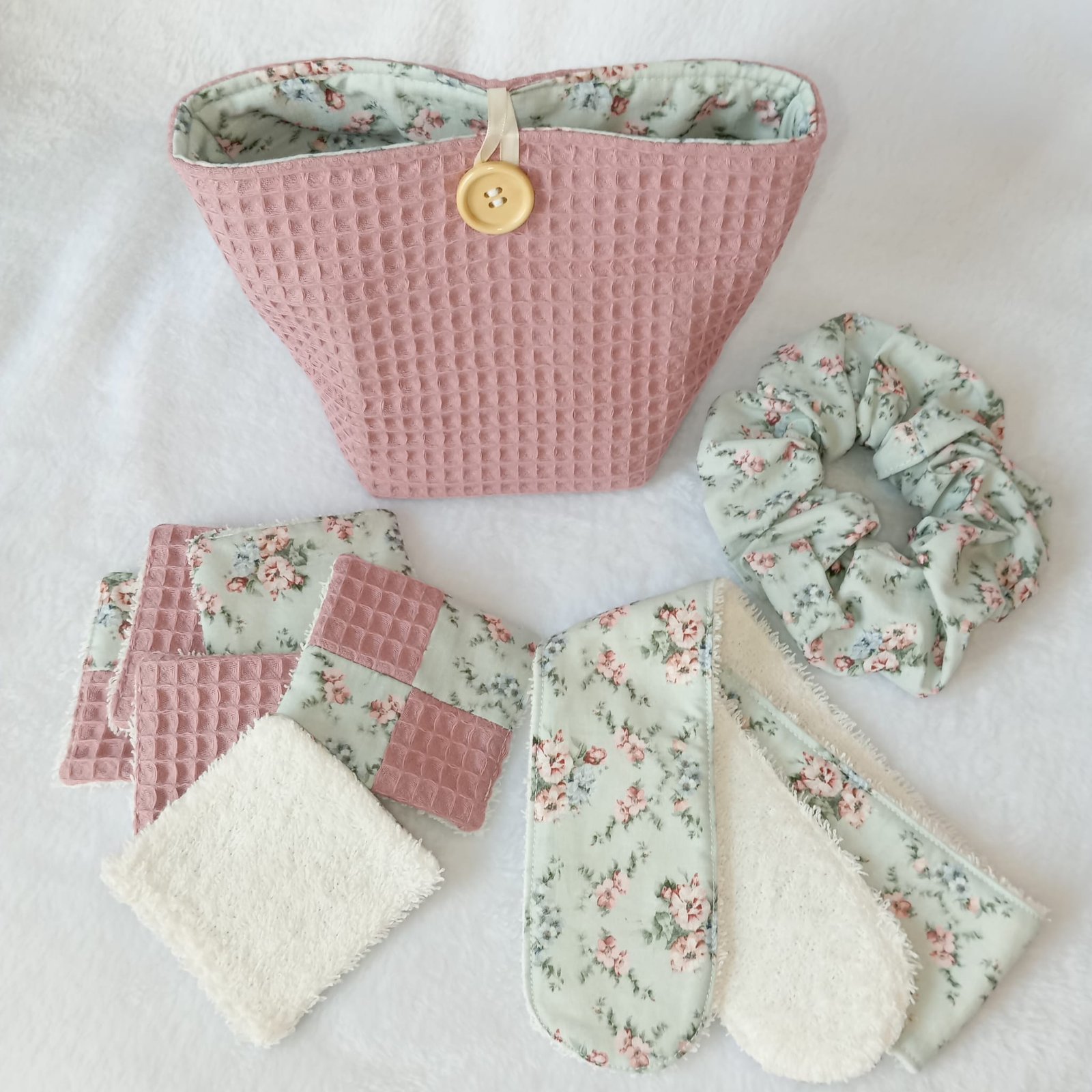 Seis discos reutilizables: 8 × 8 cm. Una cara de toalla de algodón crudo y la otra combinada entre Popelín, Jardín de Rosas y waffle old rose.